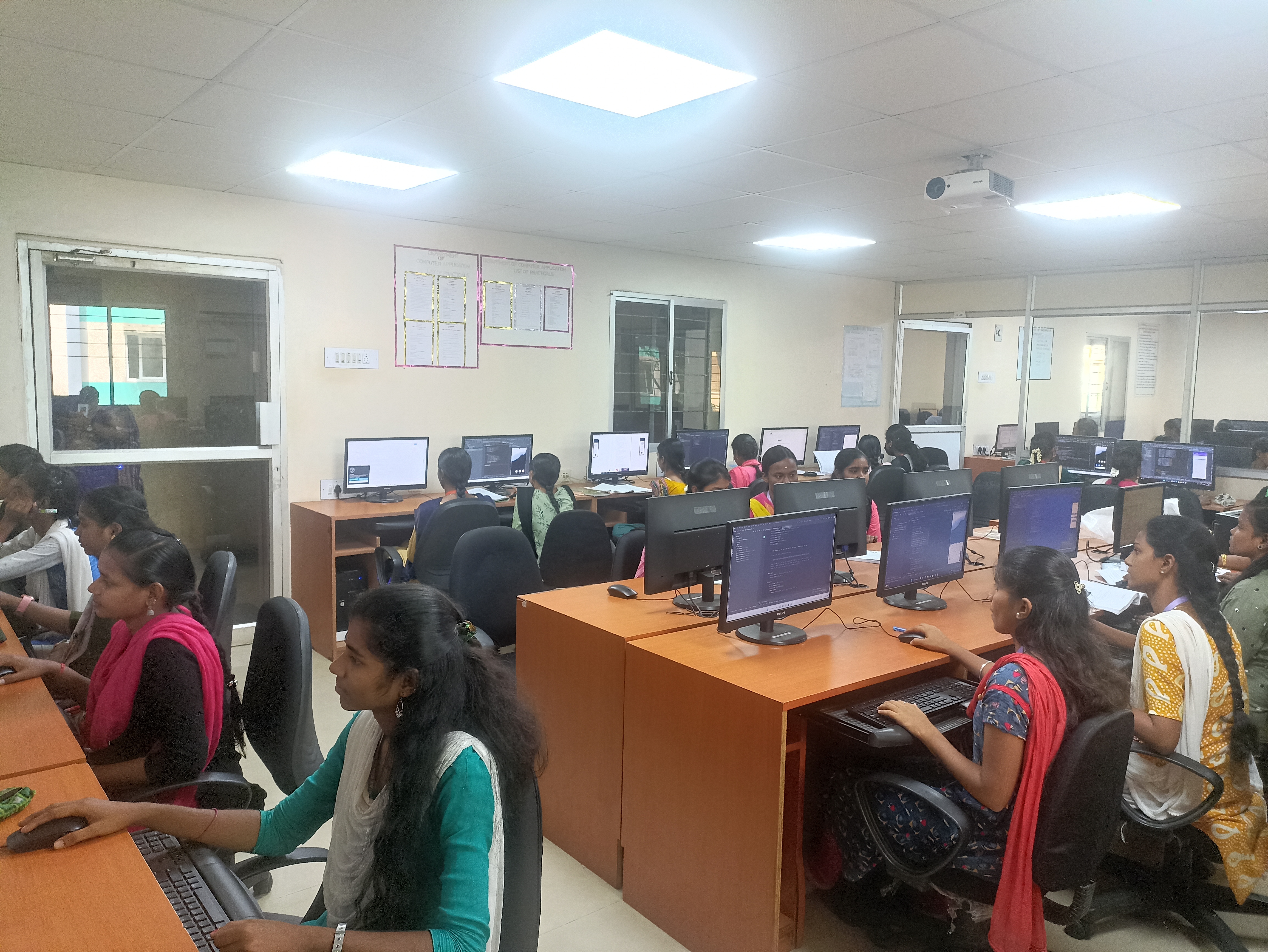 The Departments of Computer Science, Computer Applications and Information Technology are equipped with excellent, sophisticated computer laboratories with state-of-the art computing facilities and latest systems configuration. The UG and PG courses maintain separate labs with the student-machine ratio as 1:1. The labs accommodate around 150 systems which are fully networked and up-to-date software requirements with respect to the curriculum have been installed to cater to the needs of the students of the UG/ PG streams. Internet with Wi-Fi facility is also available in the laboratories. The students are given practical training in a variety of software to meet the challenges in the IT industry. In addition to the academic practicals, internet browsing, student marks/nominal roll entry as per the University’s regulations and soft skill training for the students of the college are also administered through the computer labs.